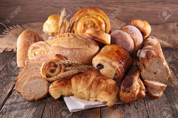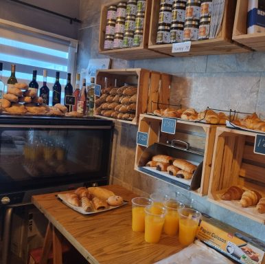 y Zumo de Naranja recién exprimido, (excepto domingos): Pan blanco, pan integral 9 cereales, croissants, napolitana chocolate, bollo de pasas nueces y crema, empanadilla de guisantes, napolitana bacon y queso, etc.