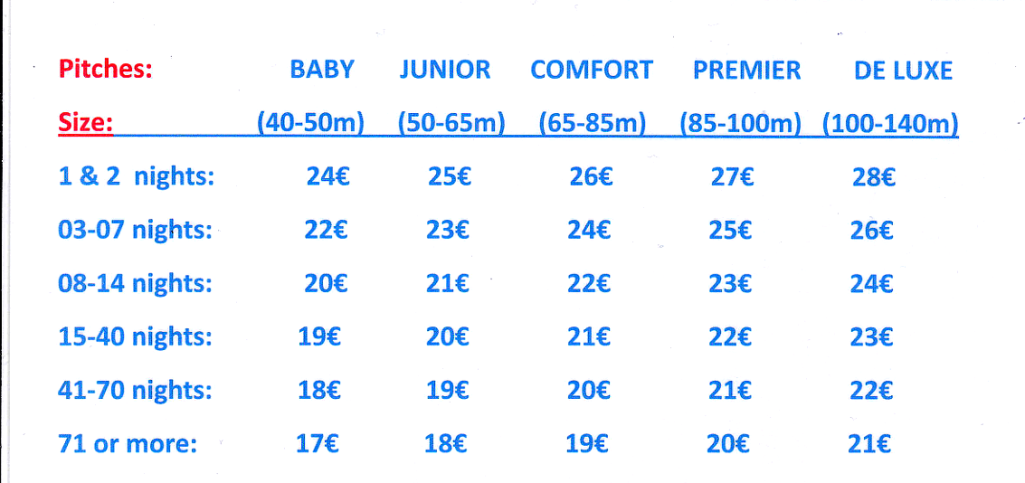 Pitch + 2 people + motorhome/caravan + all vehicles + tents + awnings + animals + use of all common areas (bathrooms, sinks, living room, dining room, petanque, yoga/gym area, terrace, solarium, etc.). Also included is water consumption + Wi-Fi + waste/waste water emptying + use of recycling bins + parcel reception, etc.